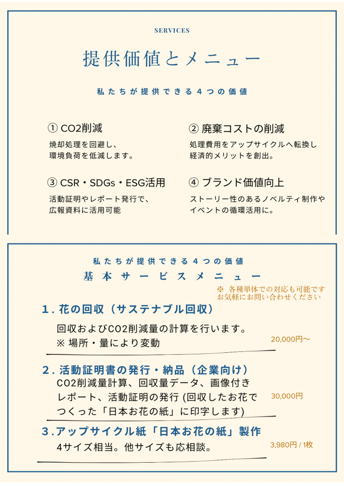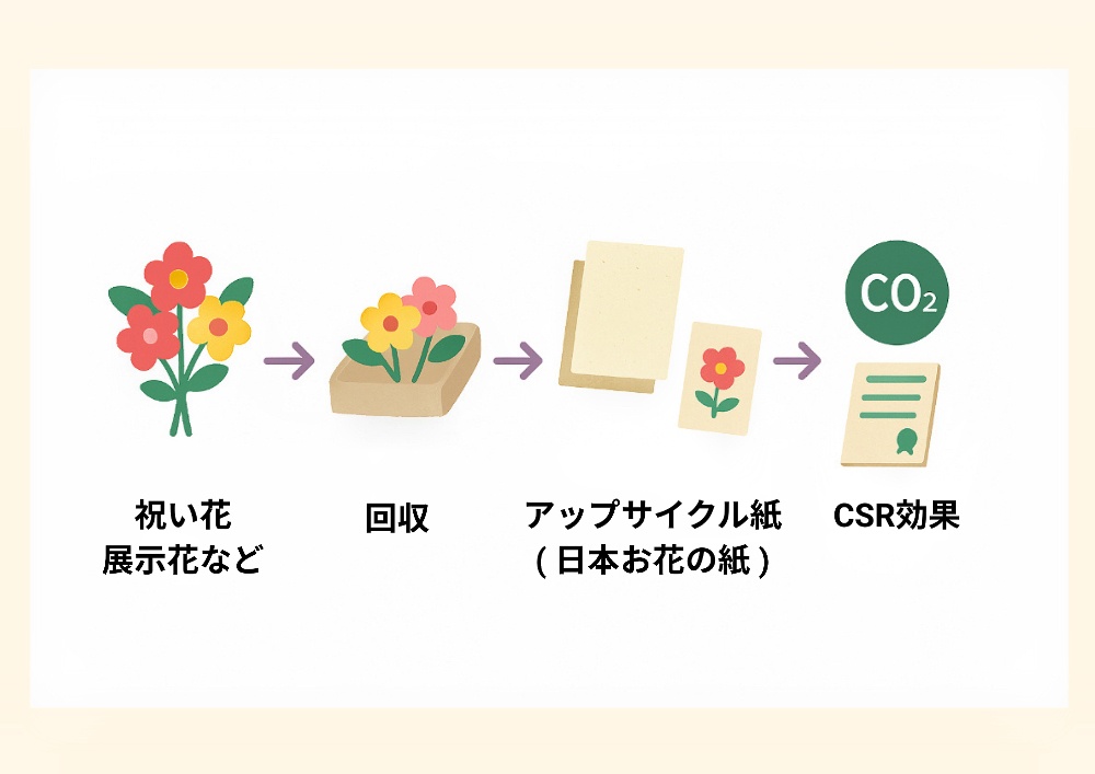 当社はイベントや祝い花で使用された花を回収し、アップサイクル紙「日本お花の紙」へと生まれ変わらせる、サステナブル事業を行っています。